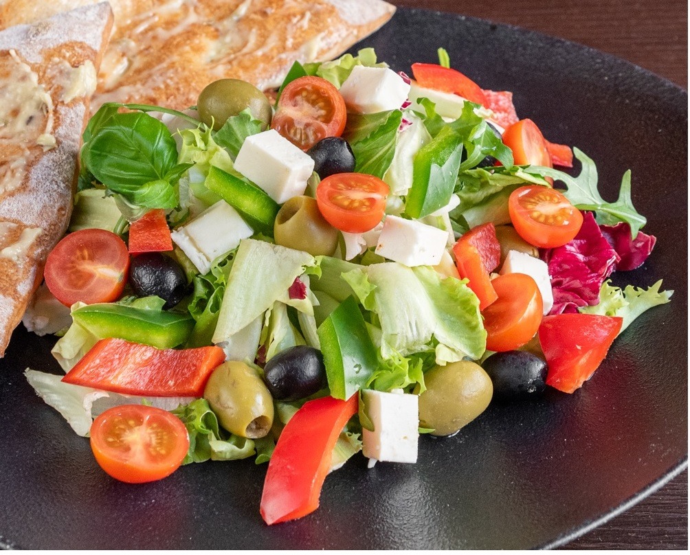 ser feta, czarne oliwki, pomidorki, papryka, mix sałat ( dwa osobno pakowane dania , bez żadnych modyfikacji ) -