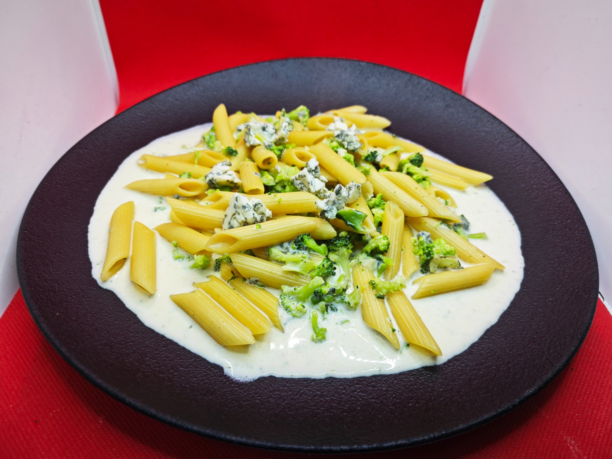 z brokułami, serem blue, śmietaną, czosnkiem, oliwą, pesto i parmezanem (dwa osobno pakowane dania, bez żadnych modyfikacji) -